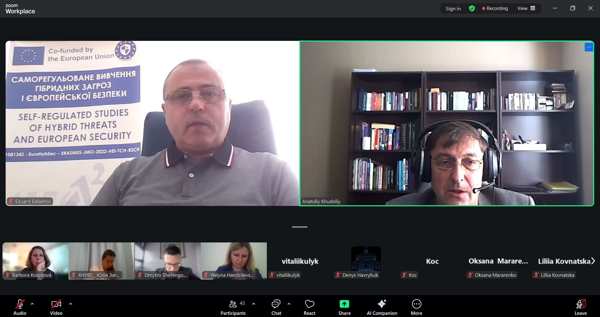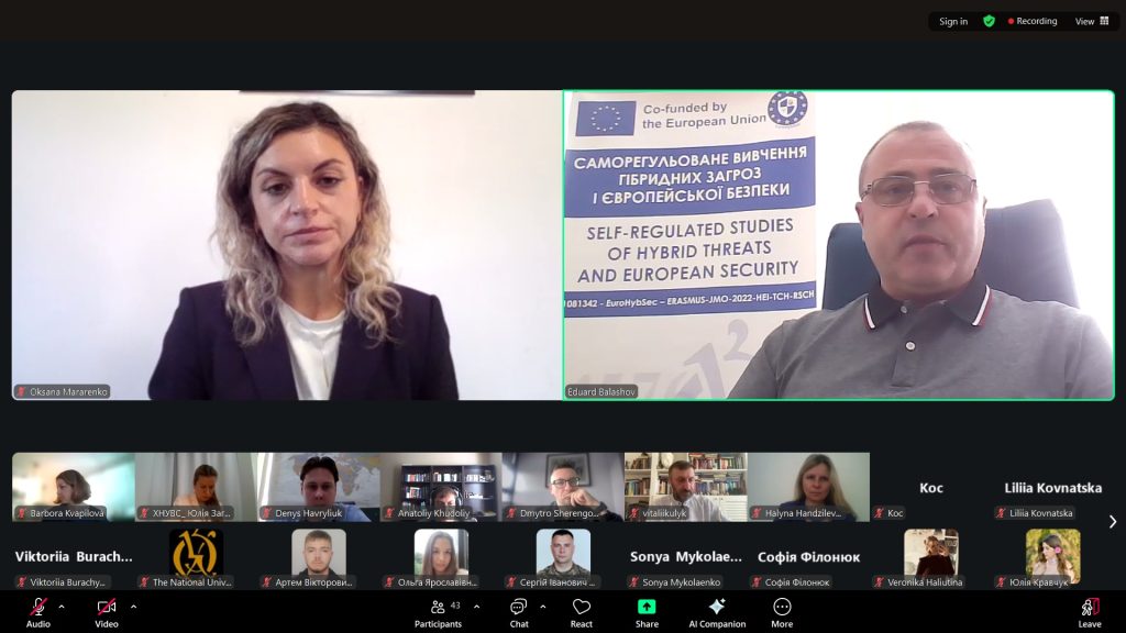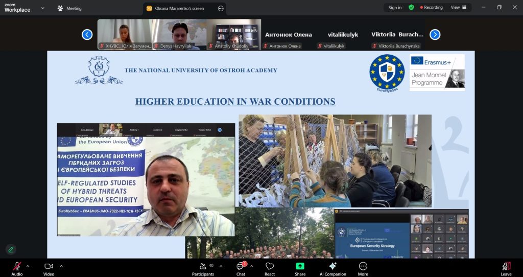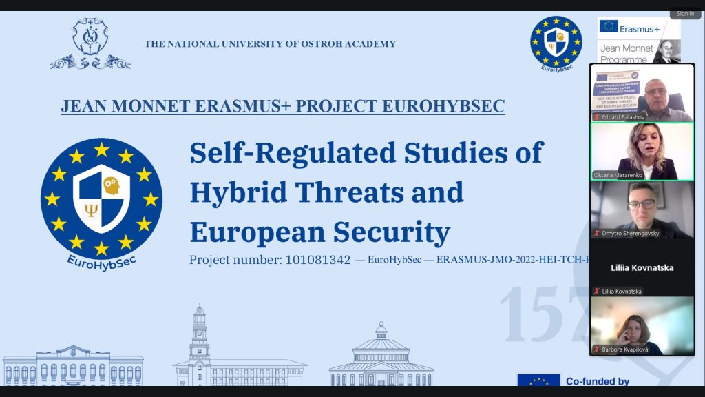 Нагадаємо, що проєкт Жана Моне «Саморегульоване вивчення гібридних загроз і європейської безпеки» (101081342 – EuroHybSec – ERASMUS-JMO-2022-HEI-TCH-RSCН) реалізується Національним університетом «Острозька академія» за співфінансування Європейського Союзу і спрямований на просування європейських принципів побудови міцного й безпечного порядку шляхом використання нових форм і методів комунікації та створення чіткого бачення європейської системи безпеки для цільових аудиторій.